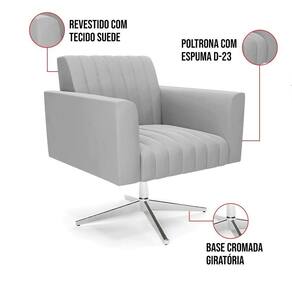 Estrutura: Madeira Eucalipto Espuma: D-23 Tecido: Suede Tipo de pés: Base Cromada Peso suportado: Até 120 Kg Garantia: 90 dias contra defeito de fabricação Montagem: O produto vai montado, apenas rosquear os pés Instruções de limpeza: Utilizar um pano limpo e levemente úmido Você irá receber: 02 Volumes com 01 Poltrona