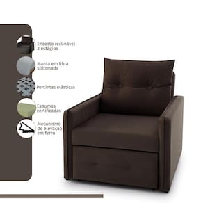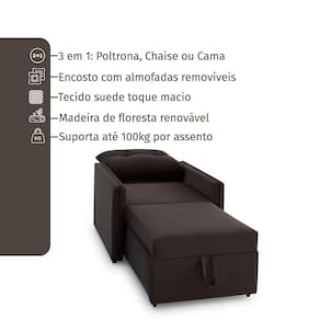 Assentos com espuma flexível de poliuretano densidade 23kg/m, certificada, fabricação própria, utilização de feltro como camada isolante, sustentados por percinta elástica. Com assento retrátil e encosto com 3 estagio de declínio ele deita totalmente virando uma cama. Enchimento do encosto: espuma D-23 e fibra de poliéster siliconada. Estrutura de madeira maciça de pinus e eucalipto 100% reflorestada. Fixação da estrutura: grampos galvanizados anti-ferrugem. Apoiados no chão com sapatas de pvc. Revestimento/tecido: suede 100% poliéster, com toque macio.