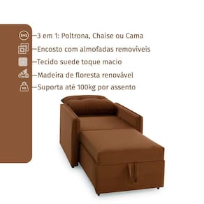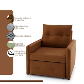 Assentos com espuma flexível de poliuretano densidade 23kg/m, certificada, fabricação própria, utilização de feltro como camada isolante, sustentados por percinta elástica. Com assento retrátil e encosto com 3 estagio de declínio ele deita totalmente virando uma cama. Enchimento do encosto: espuma D-23 e fibra de poliéster siliconada. Estrutura de madeira maciça de pinus e eucalipto 100% reflorestada. Fixação da estrutura: grampos galvanizados anti-ferrugem. Apoiados no chão com sapatas de pvc. Revestimento/tecido: suede 100% poliéster, com toque macio.