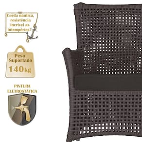 A corda nautica adiciona um toque de rusticidade moderna, enquanto o estofado impermeavel garante que sua poltrona esteja sempre impecavel, mesmo apos uma chuva inesperada ou um acidente com liquidos.