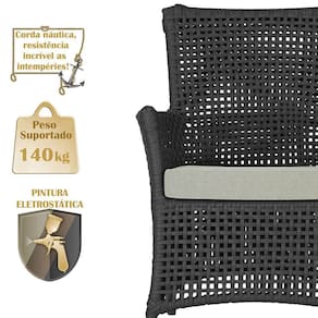 A corda nautica adiciona um toque de rusticidade moderna, enquanto o estofado impermeavel garante que sua poltrona esteja sempre impecavel, mesmo apos uma chuva inesperada ou um acidente com liquidos.