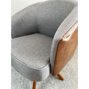 Poltrona Julia Giratoria Com Couro Pes Madeira - Luxo Decor Cinza/couro A Poltrona Julia é a escolha ideal para quem busca sofisticação aliada ao máximo de conforto. Com linhas curvas e design orgânico, ela se adapta com facilidade a diferentes estilos de decoração, sendo perfeita para compor salas de estar, quartos, recepções ou até mesmo home offices com um toque moderno e acolhedor. Seu acabamento refinado e estrutura robusta garantem durabilidade e funcionalidade no dia a dia. Equipada com base giratória, assento fixo com espuma D28 e encosto com espuma D26 e pluma siliconada, proporciona uma experiência de conforto superior, ideal para momentos de relaxamento ou socialização. A combinação de madeira de reflorestamento e materiais de alto padrão reflete o compromisso com sustentabilidade e qualidade.
