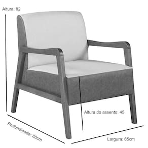 Altura 82 cm Profundidade 88 cm Largura 65 cm Quantidade de lugares 1 Peso suportado por assento 120 kg Tecido Linho Premium Material da Estrutura Eucalipto Assento Percintas elásticas, espuma D26 soft (qualidade contínua 5 cm espessura) Tipo do Encosto Fixo com espuma D26 Soft de 4 cm Base / Braço