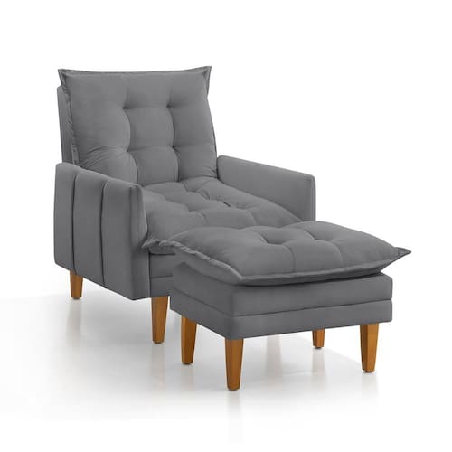 Encosto reclinável em 3 posições, apoio para braços e puff para estender as pernas.