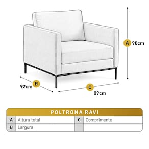 Cuidado simples: Use pano levemente umedecido, seguido de seco. Evite exposição direta ao sol e não utilize escovas. Acompanha Almofadas extras: Não Acompanha Puff: Não Almofada do assento: Fixa Almofada do encosto: Removível Altura do assento até o chão: 48 cm Altura do Encosto: 50 cm Altura dos Pés: 12 cm Ambiente Principal: Sala de Estar codigo_ean: 7900288249593 Complexidade da Montagem: Baixa: pode ser montado por uma pessoa sozinha Cor: Bege Cor do Produto: Bege Design Assinado: Não Enchimento do Assento: Espuma D-26 Enchimento do Braço: Espuma D-23 Encosto para a Cabeça: Não Estampado: Não Extensível: Não Firmeza do Assento: Médio Itens Inclusos: 1 Poltrona Linha ou Coleção: Ravi Marca: Castellar Móbile Material do Braço: Estofado Material dos Pés: Metal Modelo de Poltrona: Fixo Necessita Montagem: Sim Origem do Produto: Nacional Peso: 20 kg Possui Percintas Elásticas: Sim Possui Pés: 04 Possui Rodízio: Não Recomendações de Uso, Manutenção e Limpeza: Utilizar um pano levemente umedecido, seguido de pano seco. Evitar exposição ao sol, para que não sofra alterações na cor do tecido. Não limpar com escovas ou semelhantes. Sistema de Montagem: Chave de fenda/Philips/Parafusadeira Suporta Até (kg): 140 kg Tecido Predominante: Linho Tipo de Assento: Fixo Tipo de Encosto: Fixo Tipo de Espuma do Assento: Espuma Convencional Tipo de Poltrona: Decorativa