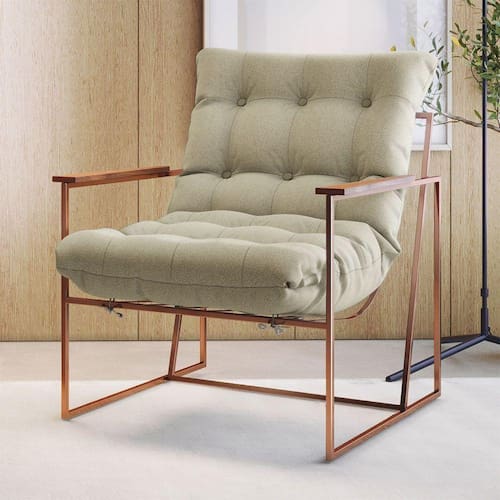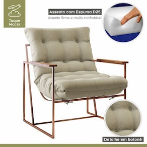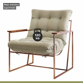 Poltrona M03 Estrutura Em Ferro Mais Decor Cobre/bege Dona de uma tonalidade classica e design que se destaca em qualquer ambiente, a Poltrona M03 vai oferecer o empurraozinho que seu lar-style precisa para ficar impecavel. Com estrutura moderna, o cantinho em que escolher posiciona-la - seja sala de estar, dormitorio ou home office - ficara aconchegante e os momentos relax serao muito mais completos e prazerosos. De quebra, a decoracao vai ganhar uma aliada de muito charme e que sera essencial para deixar o dia a dia ai na sua casa mais bonito e sofisticado. Caracteristicas: Marca: Mais Decor Modelo: M03 Tecido Predominante: Linho Material da Estrutura: Ferro Tipo de Poltrona: Decorativa Acompanha Puff: Nao Tipo de Encosto: Fixo Almofada do Encosto: Fixa Enchimento do Encosto: Espuma D-18 Altura do Encosto: 50 cm Tipo de Espuma do Encosto: Fibra Siliconada Tipo de Assento: Fixo Altura do Assento ate o Chao: 45 cm Enchimento do Assento: Espuma D-26 Firmeza do Assento: Medio Tipo de Espuma do Assento: Espuma Convencional Material do Braco: Madeira Possui Apoio para Bracos: Sim Enchimento do Braco: Nao Possui Possui Pes: 04 Material dos Pes: Ferro Altura dos Pes: 31 cm Necessita Montagem: Nao Recomendacoes de Uso, Manutencao e Limpeza: Uma boa maneira de aumentar o tempo de vida util do seu sofa e evitar exposicao direta do estofado ao sol, ja que os raios podem queimar e manchar a grande maioria dos tecidos desses itens da sua casa. Suporta Ate (kg): 120 Possui Percintas Elasticas: Sim
