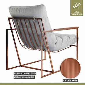 Poltrona M03 Estrutura Em Ferro Mais Decor Cobre/cinza Dona de uma tonalidade classica e design que se destaca em qualquer ambiente, a Poltrona M03 vai oferecer o empurraozinho que seu lar-style precisa para ficar impecavel. Com estrutura moderna, o cantinho em que escolher posiciona-la - seja sala de estar, dormitorio ou home office - ficara aconchegante e os momentos relax serao muito mais completos e prazerosos. De quebra, a decoracao vai ganhar uma aliada de muito charme e que sera essencial para deixar o dia a dia ai na sua casa mais bonito e sofisticado. Caracteristicas: Marca: Mais Decor Modelo: M03 Tecido Predominante: Linho Material da Estrutura: Ferro Tipo de Poltrona: Decorativa Acompanha Puff: Nao Tipo de Encosto: Fixo Almofada do Encosto: Fixa Enchimento do Encosto: Espuma D-18 Altura do Encosto: 50 cm Tipo de Espuma do Encosto: Fibra Siliconada Tipo de Assento: Fixo Altura do Assento ate o Chao: 45 cm Enchimento do Assento: Espuma D-26 Firmeza do Assento: Medio Tipo de Espuma do Assento: Espuma Convencional Material do Braco: Madeira Possui Apoio para Bracos: Sim Enchimento do Braco: Nao Possui Possui Pes: 04 Material dos Pes: Ferro Altura dos Pes: 31 cm Necessita Montagem: Nao Recomendacoes de Uso, Manutencao e Limpeza: Uma boa maneira de aumentar o tempo de vida util do seu sofa e evitar exposicao direta do estofado ao sol, ja que os raios podem queimar e manchar a grande maioria dos tecidos desses itens da sua casa. Suporta Ate (kg): 120 Possui Percintas Elasticas: Sim