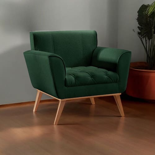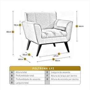 Verificar dimensões para acesso ao local de uso Acompanha Almofadas extras: Não Acompanha Puff: Não Almofada do assento: Não Possui Almofada do encosto: Fixa Altura do assento até o chão: 43 cm Altura do Encosto: 31 cm Altura dos Pés: 24 cm Ambiente Principal: Sala de Estar Complexidade da Montagem: Baixa: pode ser montado por uma pessoa sozinha Cor: Verde Cor do Produto: Verde Design Assinado: Não Enchimento do Braço: Espuma D-26 Enchimento do Encosto: Espuma D-26 Encosto para a Cabeça: Não Estampado: Não Extensível: Não Informações Complementares: Base bordada. Itens Inclusos: 1 Poltrona Linha ou Coleção: PREMIUM Material do Braço: Madeira Estofada Material dos Pés: Madeira Maciça Modelo de Poltrona: Fixo Necessita Montagem: Sim Origem do Produto: Nacional Peso: 24,1 kg Possui Percintas Elásticas: Sim Possui Pés: 04 Possui Rodízio: Não Recomendações de Uso, Manutenção e Limpeza: Utilizar um pano levemente umedecido, seguido de pano seco.Evitar exposição ao sol, para que não sofra alterações na cor do tecido.Não limpar com escovas ou semelhantes. Sistema de Montagem: Enroscar os pés na base Suporta Até (kg): 140 kg Tecido Predominante: Veludo Tipo de Assento: Fixo Tipo de Encosto: Fixo Tipo de Espuma do Encosto: Soft Tipo de Poltrona: Decorativa
