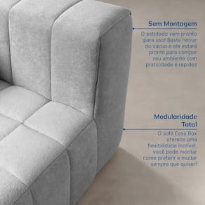 O sofá modular compactado torna o processo de compra de sofás uma experiência descomplicada e surpreendente, através das muitas possibilidades de design em um único sofá, apresenta um tecido selecionado por especialistas: um boucle sofisticado com alta resistência a arranhões de gatos, tornando-o pet friendly. Além disso, é de fácil limpeza e traz alta durabilidade. Na parte inferior possui fecho de contato, garantindo a união dos módulos do sofá. Com essa conexão rápida, você pode montar o sofá modular como quiser e ter a certeza de que os módulos permanecerão firmemente conectados. Acompanha Almofadas extras: 01 Acompanha Puff: Não Almofada do assento: Não Possui Almofada do encosto: Não Possui Altura do assento até o chão: 35 cm Altura do Encosto: 33 cm Ambiente Principal: Sala de Estar Cor: Cinza Claro Cor do Produto: Cinza Claro Design Assinado: Não Encosto para a Cabeça: Sim Estampado: Não Extensível: Não Itens Inclusos: 1 Poltrona para Sala de Estar Linha ou Coleção: Easybox Manual de Montagem e Instalação: https://product-hub-prd.madeiramadeira.com.br/966368/documents/dca0cc64-f3ef-4d68-a0d9-644a41aba1102512532342817302199168752.pdf Marca: CabeCasa MadeiraMadeira Modelo de Poltrona: Fixo Necessita Montagem: Não Peso: 12,4 kg Possui Percintas Elásticas: Não Possui Pés: Não Recomendações de Uso, Manutenção e Limpeza: Para a limpeza diária do seu sofá, utilize o aspirador para manter o sofá impecável, para manchas, água e sabão neutro. Em caso de serviço contratado para a limpeza, recomendamos profissional para limpeza mais intensa. Considere a impermeabilização para proteção extra. Suporta Até (kg): 100 kg Tecido Predominante: Boucle Tipo de Assento: Fixo Tipo de Encosto: Fixo Tipo de Poltrona: Leitura