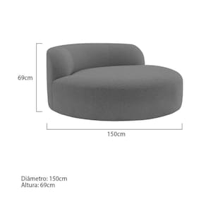 Descubra a Poltrona Redonda Chaise Rússia, uma peça que combina perfeitamente estilo moderno com conforto envolvente. Seu design circular e acolhedor não apenas oferece um visual contemporâneo, mas também proporciona um espaço íntimo e relaxante em qualquer ambiente da sua casa. Ideal para criar um canto de leitura acolhedor na sala de estar, ou para adicionar um toque de elegância ao seu escritório, esta poltrona se destaca pela sua versatilidade e conforto. Medidas da Poltrona: Diâmetro: 150 cm Altura: 69 cm Observações importantes - Produto para uso residencial em ambiente interno, não devendo ficar exposto diretamente ao sol, calor e umidades excessivas. - Pode haver alguma diferença de tonalidade entre a imagem e o produto real, por conta do tratamento de imagens e a calibração de cores do seu monitor. - As imagens são meramente ilustrativas, não acompanham objetos de decoração e eletrônicos. - Ao receber a mercadoria, o cliente deve verificar as condições da embalagem, caso haja alguma não assine o de . - Montagem, desmontagem e outras instalações serão de responsabilidade do cliente. Não nos responsabilizamos, no ato da , por subir escadas/elevadores ou pelo por guincho em apartamentos. Eventuais despesas são de responsabilidade do comprador. - Confira as dimensões do produto e certifique-se de que passará normalmente por supostos elevadores, portas, escadas e/ou corredores de sua residência