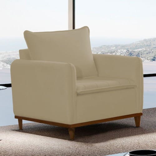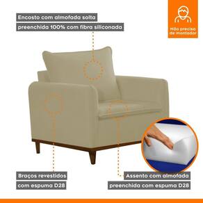 Apresentamos nossa poltrona de luxo, projetada para proporcionar conforto incomparável e estilo elegante. Com estofamento de alta qualidadel, oferece o máximo em relaxamento. Seu design contemporâneo e durabilidade excepcional fazem o complemento perfeito para qualquer espaço. Transforme sua casa ou escritório em um oásis de conforto e sofisticação com nossa poltrona. Acompanha Almofadas extras: Não Acompanha Puff: Não Almofada do assento: Fixa Almofada do encosto: Removível Altura do assento até o chão: 43 Altura do Encosto: 34 Altura dos Pés: 13 Ambiente Principal: Sala de Estar Complexidade da Montagem: Baixa: pode ser montado por uma pessoa sozinha Cor: Jolie/Bege Cor do Produto: Jolie/Bege Design Assinado: Não Enchimento do Assento: Espuma D-28 Enchimento do Braço: Espuma D-28 Enchimento do Encosto: Fibra Siliconada Encosto para a Cabeça: Não Estampado: Não Extensível: Não Firmeza do Assento: Macio Informações Complementares: Molas Espiral Itens Inclusos: 1 Poltrona, kit de ferragens, orientação de montagem Linha ou Coleção: Armany Manual de Montagem e Instalação: https://product-hub-prd.madeiramadeira.com.br/903983/documents/48533048-18dd-480d-89ea-b313d984c98419020108.pdf Material do Braço: 10cm revestidos com Espuma D-28 e manta acrílica Material dos Pés: Madeira Modelo de Poltrona: Fixo Necessita Montagem: Sim Origem do Produto: Nacional Peso: 20 Possui Percintas Elásticas: Sim Possui Pés: 04 Possui Rodízio: Não Recomendações de Uso, Manutenção e Limpeza: A limpeza do revestimento deve ser feita com escova ou tecido de algodão branco levemente umedecidos em água morna, sabão neutro ou produto específico. Não usar produtos corrosivos nem a base de solventes, como: cloro, alvejantes, detergentes, entre outros;Não expor o estofado à luz direta. Mantenha portas e janelas sempre protegidas com cortinas e blackout. A exposição contínua à radiação da luz, danifica o revestimento, apodrecendo os fios, trincando a superfície e desbotando as cores;Não lavar o revestimento das almofadas pois pode desfiá-las, abrindo as costuras;Não utilizar o estofado para fins diferentes do que foi projetado: ficar em pé, pular, arrastar, sentar nos braços, peso na caixa traseira, entre outros tipos de ações que poderão danificar o produto. Resistente à Chuva: Não Sistema de Montagem: Parafusos Suporta Até (kg): 120 Tecido Predominante: Veludo Tipo de Assento: Fixo Tipo de Encosto: Fixo Tipo de Espuma do Assento: Soft Tipo de Espuma do Encosto: Fibra Siliconada Tipo de Poltrona: Decorativa