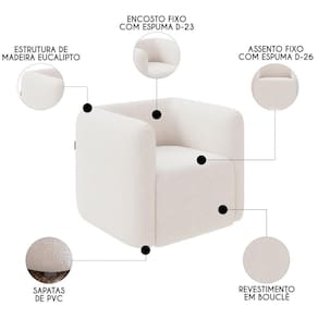 Com seu estilo orgânico, essa Poltrona Quadrada não apenas complementa a decoração de qualquer ambiente, mas também se torna o ponto focal, convidando todos a se sentarem. As curvaturas suaves proporcionam conforto sem igual. O assento é composto por espuma D-26, e o encosto com espuma D-23 que garantem firmeza e conforto. Além disso, o assento é sustentado por percintas elásticas, que aumentam a resistência. Os braços do sofá são com espuma D-26, que oferecem maciez e apoio. Um design moderno e elegante, com um tecido bouclê que se destaca pela sua textura e aparência, que é agradável ao toque e muito confortável. Ela é ideal para quem busca um móvel que valorize a decoração da Sala De Estar e ofereça conforto para os momentos de lazer.