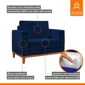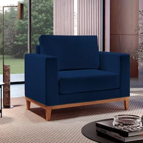 Além de ser uma excelente aliada na hora de transformar seu lar em um ambiente mais receptivo e bonito, esta linda Poltrona Emily é um mimo para decoração de qualquer cômodo de sua preferencia. Confeccionada com espumas, ela é perfeita para que você acomode e relaxe seu corpo para ler um livro ou assistir aos seus programas de TV favoritos. A estrutura possui madeira em Eucalipto, que além de resistente, é proveniente de reflorestamento e, portanto, ecologicamente correta. Por fim, o revestimento em Linho, deixa o ambiente muito mais clean e convidativo. Não é demais? Aproveite! Acompanha Almofadas extras: Não Acompanha Puff: Não Almofada do assento: Fixa Almofada do encosto: Fixa Altura do assento até o chão: 46 cm Altura do Encosto: 54 cm Altura dos Pés: 13 cm Ambiente Principal: Sala de Estar Cor: Veludo Azul Cor do Produto: Veludo Azul Design Assinado: Não Enchimento do Assento: Espuma D-28 Enchimento do Braço: Espuma D-18 Enchimento do Encosto: Espuma D-18 Encosto para a Cabeça: Não Estampado: Não Extensível: Não Firmeza do Assento: Médio Informações Complementares: Assento com molas espirais Itens Inclusos: 1 Poltrona Material do Braço: Madeira de Eucalipto e Espuma Material dos Pés: Madeira Modelo de Poltrona: Fixo Necessita Montagem: Não Origem do Produto: Nacional Peso: 25,4 kg Possui Percintas Elásticas: Sim Possui Pés: 04 Possui Rodízio: Não Recomendações de Uso, Manutenção e Limpeza: Não utilizar produtos químicos. Não utilizar produtos abrasivos. Não molhar. Utilizar pano macio e seco ou levemente umedecido. Suporta Até (kg): 120 kg Tecido Predominante: Veludo Tipo de Assento: Fixo Tipo de Encosto: Fixo Tipo de Espuma do Assento: Espuma Convencional Tipo de Poltrona: Decorativa