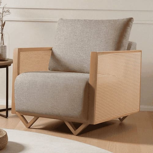 A Poltrona Arthur é a sua chance de ter um design atemporal com o charme da beleza natural. Inspirada na elegância autêntica, sua estrutura em madeira aparente e os delicados detalhes em rattan adicionam charme e leveza, criando aquele ambiente acolhedor e sofisticado que você sempre quis.