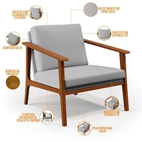 A praticidade e facilidade de compor qualquer ambiente a tornam ainda mais atraente, também merece destaque a estrutura em madeira, na cor nozes, o encosto estofado com a almofada solta que deixam tudo melhor e equilibrado em seu espaço.