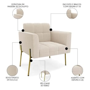 Se você quer uma poltrona que combine com a sua Sala De Estar, recepção ou seu quarto, que ofereça conforto e qualidade? Então você vai adorar a Poltrona Para Sala Pés Metálicos Dourado Ana Bouclé Bege, da Ibiza!