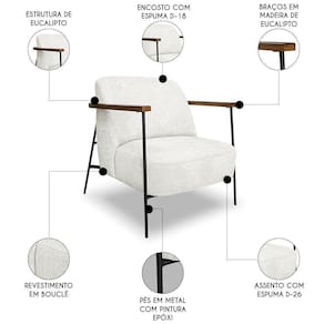 A base da poltronas em aço carbono, complementada por uma pintura epóxi automotiva de alto padrão, não apenas garante durabilidade, mas também adiciona um toque de sofisticação. O assento é feito com espuma HR28, conhecida por sua alta resiliência e conforto, enquanto o encosto utiliza espuma D23 Soft, proporcionando um suporte suave e agradável. O uso de madeira maciça de eucalipto nos braços das poltronas traz a beleza natural da madeira para o design. Já o revestimento em Boucle, com sua textura característica, oferece um acabamento elegante e contemporâneo, tornando a Poltrona Decorativa uma escolha distinta para quem busca conforto e estilo em uma peça.