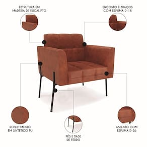 Esta Poltrona Para Sala é revestida em Sintético PU, que é durável e fácil de limpar, e ainda valoriza o design da poltrona. Os braços e encosto são confortáveis em espuma D-18, já o assento é com espuma D-26 de alta densidade, que garante um assento firme e aconchegante, ideal para relaxar após um dia cansativo. Os Pés de Ferro, não só garantem estabilidade e longevidade, mas também adicionam um toque de luxo ao design geral. A poltrona tem uma estrutura resistente e suporta até 120 kg. A montagem é muito simples, pois a Poltrona já vem pronta, bastando apenas fixar a base com os parafusos que acompanham o produto. A limpeza também é muito prática, pois basta utilizar um pano limpo e levemente úmido, sem produtos abrasivos, para manter a sua poltrona sempre em bom estado. Sem dúvidas um item que vai transformar a sua sala em um ambiente mais confortável e estiloso!