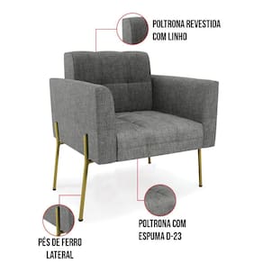 Você gosta de colecionar vários momentos memoráveis com sua família e amigos? Que tal recebê-los, com móveis de altíssima qualidade que só a D'Rossi tem? A Poltrona Elisa é adequada para você! Seu design retrô é a grande tendência do momento. Pode ser usada em diversos espaços da casa, em salas, hall de entrada, quartos, cozinhas, varanda, sacada, escritório, dentre outros. Contém as seguintes características: A estrutura é feita Madeira de Eucalipto 100% de reflorestamento, Pés de Ferro Dourado que além de ser resistente e durável, suporta em média até 120 kg. Assento, encosto e braços, contém enchimento de espuma D-23 e é estofada em tecido Linho no tom Grafite, que oferece muito conforto e resistência ao sentar, com aquela sensação de maciez e aconchego. Possui também, detalhes de costura no encosto e assento, resultando em um acabamento impecável, conferindo muito mais valor e elegância ao seu espaço. Para complementar a decoração com essa linda poltrona, a dica é utilizar mantas, almofadas ou vasinho de flor. E pronto, seu cantinho estará perfeito para descansar e relaxar! Aqui, você encontra várias opções, para que seus amigos e familiares se sintam acolhidos. Garanta já sua Poltrona.