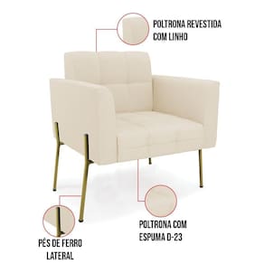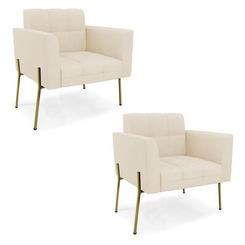 Você gosta de colecionar vários momentos memoráveis com sua família e amigos? Que tal recebê-los, com móveis de altíssima qualidade que só a D'Rossi tem? A Poltrona Elisa é adequada para você! Seu design retrô é a grande tendência do momento. Pode ser usada em diversos espaços da casa, em salas, hall de entrada, quartos, cozinhas, varanda, sacada, escritório, dentre outros. Contém as seguintes características: A estrutura é feita Madeira de Eucalipto 100% de reflorestamento, Pés de Ferro Dourado que além de ser resistente e durável, suporta em média até 120 kg. Assento, encosto e braços, contém enchimento de espuma D-23 e é estofada em tecido Linho no tom Bege, que oferece muito conforto e resistência ao sentar, com aquela sensação de maciez e aconchego. Possui também, detalhes de costura no encosto e assento, resultando em um acabamento impecável, conferindo muito mais valor e elegância ao seu espaço. Para complementar a decoração com essa linda poltrona, a dica é utilizar mantas, almofadas ou vasinho de flor. E pronto, seu cantinho estará perfeito para descansar e relaxar! Aqui, você encontra várias opções, para que seus amigos e familiares se sintam acolhidos. Garanta já seu Kit 2 Poltronas..