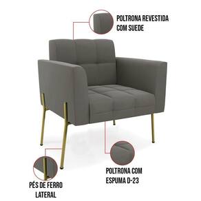 Você gosta de colecionar vários momentos memoráveis com sua família e amigos? Que tal recebê-los, com móveis de altíssima qualidade que só a D'Rossi tem? A Poltrona Elisa é adequada para você! Seu design retrô é a grande tendência do momento. Pode ser usada em diversos espaços da casa, em salas, hall de entrada, quartos, cozinhas, varanda, sacada, escritório, dentre outros. Contém as seguintes características: A estrutura é feita Madeira de Eucalipto 100% de reflorestamento, Pés de Ferro Dourado que além de ser resistente e durável, suporta em média até 120 kg. Assento, encosto e braços, contém enchimento de espuma D-23 e é estofada em tecido Suede no tom Grafite, que oferece muito conforto e resistência ao sentar, com aquela sensação de maciez e aconchego. Possui também, detalhes de costura no encosto e assento, resultando em um acabamento impecável, conferindo muito mais valor e elegância ao seu espaço. Para complementar a decoração com essa linda poltrona, a dica é utilizar mantas, almofadas ou vasinho de flor. E pronto, seu cantinho estará perfeito para descansar e relaxar! Aqui, você encontra várias opções, para que seus amigos e familiares se sintam acolhidos. Garanta já sua Poltrona.