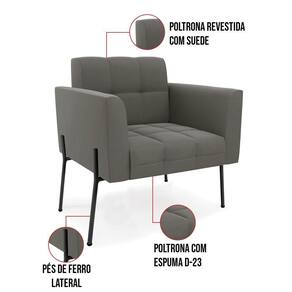 Você gosta de colecionar vários momentos memoráveis com sua família e amigos? Que tal recebê-los, com móveis de altíssima qualidade que só a D'Rossi tem? A Poltrona Elisa é adequada para você! Seu design retrô é a grande tendência do momento. Pode ser usada em diversos espaços da casa, em salas, hall de entrada, quartos, cozinhas, varanda, sacada, escritório, dentre outros. Contém as seguintes características: A estrutura é feita Madeira de Eucalipto 100% de reflorestamento, Pés de Ferro Preto que além de ser resistente e durável, suporta em média até 120 kg. Assento, encosto e braços, contém enchimento de espuma D-23 e é estofada em tecido Suede no tom Grafite, que oferece muito conforto e resistência ao sentar, com aquela sensação de maciez e aconchego. Possui também, detalhes de costura no encosto e assento, resultando em um acabamento impecável, conferindo muito mais valor e elegância ao seu espaço. Para complementar a decoração com essa linda poltrona, a dica é utilizar mantas, almofadas ou vasinho de flor. E pronto, seu cantinho estará perfeito para descansar e relaxar! Aqui, você encontra várias opções, para que seus amigos e familiares se sintam acolhidos. Garanta já sua Poltrona.
