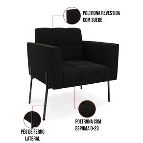 Você gosta de colecionar vários momentos memoráveis com sua família e amigos? Que tal recebê-los, com móveis de altíssima qualidade que só a D'Rossi tem? A Poltrona Elisa é adequada para você! Seu design retrô é a grande tendência do momento. Pode ser usada em diversos espaços da casa, em salas, hall de entrada, quartos, cozinhas, varanda, sacada, escritório, dentre outros. Contém as seguintes características: A estrutura é feita Madeira de Eucalipto 100% de reflorestamento, Pés de Ferro Preto que além de ser resistente e durável, suporta em média até 120 kg. Assento, encosto e braços, contém enchimento de espuma D-23 e é estofada em tecido Suede no tom Preto, que oferece muito conforto e resistência ao sentar, com aquela sensação de maciez e aconchego. Possui também, detalhes de costura no encosto e assento, resultando em um acabamento impecável, conferindo muito mais valor e elegância ao seu espaço. Para complementar a decoração com essa linda poltrona, a dica é utilizar mantas, almofadas ou vasinho de flor. E pronto, seu cantinho estará perfeito para descansar e relaxar! Aqui, você encontra várias opções, para que seus amigos e familiares se sintam acolhidos. Garanta já sua Poltrona.