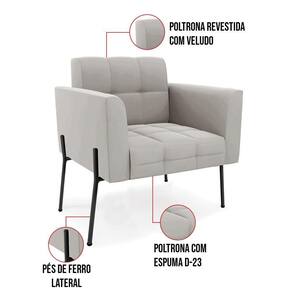 Você gosta de colecionar vários momentos memoráveis com sua família e amigos? Que tal recebê-los, com móveis de altíssima qualidade que só a D'Rossi tem? A Poltrona Elisa é adequada para você! Seu design retrô é a grande tendência do momento. Pode ser usada em diversos espaços da casa, em salas, hall de entrada, quartos, cozinhas, varanda, sacada, escritório, dentre outros. Contém as seguintes características: A estrutura é feita Madeira de Eucalipto 100% de reflorestamento, Pés de Ferro Preto que além de ser resistente e durável, suporta em média até 120 kg. Assento, encosto e braços, contém enchimento de espuma D-23 e é estofada em tecido Veludo no tom Cinza, que oferece muito conforto e resistência ao sentar, com aquela sensação de maciez e aconchego. Possui também, detalhes de costura no encosto e assento, resultando em um acabamento impecável, conferindo muito mais valor e elegância ao seu espaço. Para complementar a decoração com essa linda poltrona, a dica é utilizar mantas, almofadas ou vasinho de flor. E pronto, seu cantinho estará perfeito para descansar e relaxar! Aqui, você encontra várias opções, para que seus amigos e familiares se sintam acolhidos. Garanta já sua Poltrona.