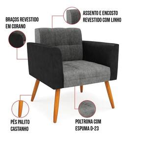 Você gosta de colecionar vários momentos memoráveis com sua família e amigos? Que tal recebê-los, com móveis de altíssima qualidade que só a D'Rossi tem? A Poltrona Elisa é adequada para você! Seu design retrô é a grande tendência do momento. Pode ser usada em diversos espaços da casa, em salas, hall de entrada, quartos, cozinhas, varanda, sacada, escritório, dentre outros. Contém as seguintes características: A estrutura é feita de madeira de Eucalipto 100% de reflorestamento, e a Pés Palito Castanho, além de ser resistente e durável, suporta em média até 120 kg. Assento, encosto e braços, contém enchimento de espuma D-23 e é estofada em tecido Corano Preto com Linho, no tom Grafite, que oferece muito conforto e resistência ao sentar, com aquela sensação de maciez e aconchego. Possui também, detalhes de costura no encosto e assento, resultando em um acabamento impecável, conferindo muito mais valor e elegância ao seu espaço. Para complementar a decoração com essa linda poltrona, a dica é utilizar mantas, almofadas ou vasinho de flor. E pronto, seu cantinho estará perfeito para descansar e relaxar! Aqui, você encontra várias opções, para que seus amigos e familiares se sintam acolhidos. Garanta já sua Poltrona.