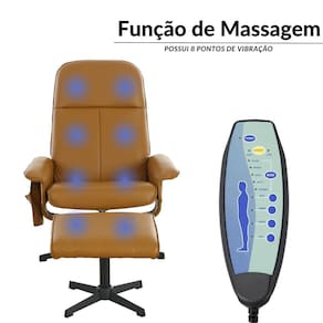 Informações técnicas Produto: Novo Fabricante: Importway Marca: Importway Modelo: IWM002CM CARAMELO Cor: Caramelo Tipo de alimentação: Corrente elétrica Voltagem: 110V/220V Frequência: 60 Hz Potência: 14W Funções: Massagem e aquecimento Material do estofamento: Couro sintético Peso máximo suportado: 130 kg Ângulo de inclinação: 150° Pontos de vibração: 8 Inclui controle remoto: Sim Encosto reclinável: Sim