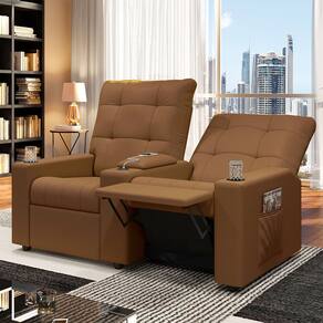 Que tal criar seu próprio home cinema? Aqui, vamos mostrar como você pode montar o seu! Com o local adequado, alguns itens decorativos e uma poltrona ideal, você garantirá um espaço confortável e imersivo. O primeiro passo é investir em equipamentos de alta qualidade! Olha só que lindeza a nossa Poltrona Reclinável Para Cinema Parma 2 Lugares. Ela foi projetada para proporcionar máximo conforto e funcionalidade, esta poltrona é a escolha ideal para quem busca relaxamento, estilo e uma experiência de cinema privada. Seu mecanismo reclinável permite ajustar a poltrona conforme suas necessidades, independente, com 2 estágios e 3 posições ajustáveis, seja para assistir a um filme, ler um livro ou simplesmente descansar. Com capacidade para suportar até 110 kg cada, oferecendo segurança e estabilidade ao consumidor. O revestimento em tecido Sintético PU Caramelo oferece um toque de sofisticação e conforto, enquanto a estrutura em madeira de eucalipto garante resistência e durabilidade. O sistema de abertura fácil permite ajustar a poltrona sem esforço: basta colocar as mãos nos braços, inclinar o corpo para trás e empurrar as mãos para frente. O encosto e o assento são sustentados por percintas elásticas. Eles são preenchidos com fibra siliconada e espuma D-26 Soft, respectivamente, para um conforto adicional. Os braços da Poltrona Reclinável contêm enchimento em espuma D-20, proporcionando um apoio suave e confortável. O assento (fixo) e o apoio de Pés Retrátil proporcionam um apoio perfeito para suas pernas, aumentando o conforto. O encosto reclinável, possibilita ajustá- lo para a posição ideal de relaxamento. Já os pés (fixos) foram feitos em madeira, adicionando um toque de elegância ao produto. E tem mais!! Ela contém lém disso, a poltrona ainda conta com porta copos, entrada USB e tipo C,baú porta objetos e um revisteiro lateral prático nas braças com um bolso prático para armazenar revistas e livros, mantendo tudo ao seu alcance. Com um design moderno e prático, esta poltrona se tornará o destaque da sua sala de estar. Afinal, sua casa merece a Poltrona Reclinável Para Cinema Parma 2 Lugares. Adquira a sua agora mesmo e transforme sua sala de estar em um verdadeiro cinema!