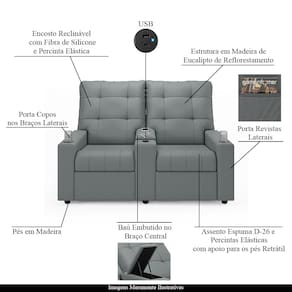 Poltrona Reclinável Para Cinema Parma 2 Lugares Baú USB PU FH1 - D`Rossi - Cinza