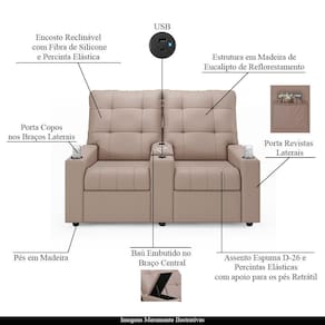 Diferenciais: Apoio de pés retrátil, bolso lateral para revistas e livros, Porta Copos Embutido nos Braços Laterais e Baú porta objetos
