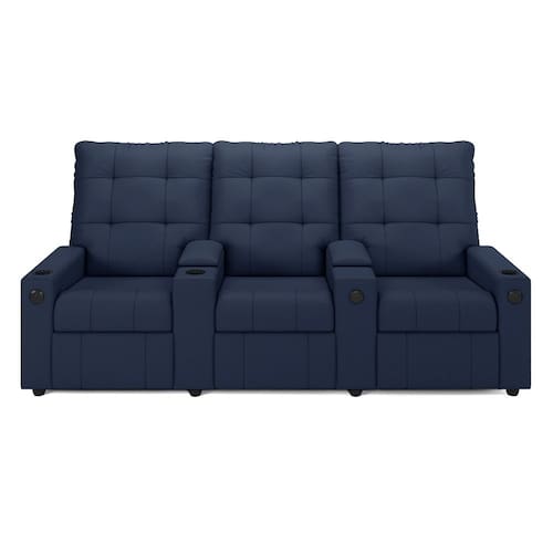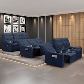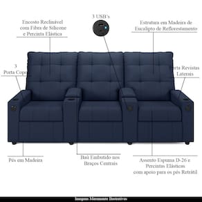 Que tal criar seu próprio home cinema? Aqui, vamos mostrar como você pode montar o seu! Com o local adequado, alguns itens decorativos e uma poltrona ideal, você garantirá um espaço confortável e imersivo. O primeiro passo é investir em equipamentos de alta qualidade! Olha só que lindeza a nossa Poltrona Reclinável Para Cinema Parma 3 Lugares. Ela foi projetada para proporcionar máximo conforto e funcionalidade, esta poltrona é a escolha ideal para quem busca relaxamento, estilo e uma experiência de cinema privada. Seu mecanismo reclinável permite ajustar a poltrona conforme suas necessidades, independente, com 2 estágios e 3 posições ajustáveis, seja para assistir a um filme, ler um livro ou simplesmente descansar. Com capacidade para suportar até 110 kg cada, oferecendo segurança e estabilidade ao consumidor. O revestimento em Sintético PU Azul oferece um toque de sofisticação e conforto, enquanto a estrutura em madeira de eucalipto garante resistência e durabilidade. O sistema de abertura fácil permite ajustar a poltrona sem esforço: basta colocar as mãos nos braços, inclinar o corpo para trás e empurrar as mãos para frente. O encosto e o assento são sustentados por percintas elásticas. Eles são preenchidos com fibra siliconada e espuma D-26 Soft, respectivamente, para um conforto adicional. Os braços da Poltrona Reclinável contêm enchimento em espuma D-20, proporcionando um apoio suave e confortável. O assento (fixo) e o apoio de Pés Retrátil proporcionam um apoio perfeito para suas pernas, aumentando o conforto. O encosto reclinável, possibilita ajustá- lo para a posição ideal de relaxamento. Já os pés (fixos) foram feitos em madeira, adicionando um toque de elegância ao produto. E tem mais!! Ela contém lém disso, a poltrona ainda conta com porta copos, entrada USB e tipo C,baú porta objetos e um revisteiro lateral prático nas braças com um bolso prático para armazenar revistas e livros, mantendo tudo ao seu alcance. Com um design moderno e prático, esta poltrona se tornará o destaque da sua sala de estar. Afinal, sua casa merece a Poltrona Reclinável Para Cinema Parma 3 Lugares. Adquira a sua agora mesmo e transforme sua sala de estar em um verdadeiro cinema!