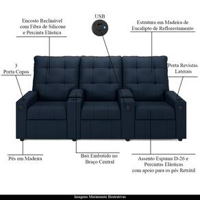 Poltrona Reclinável Para Cinema Parma 3 Lugares Baú USB Veludo FH1 - D`Rossi - Azul