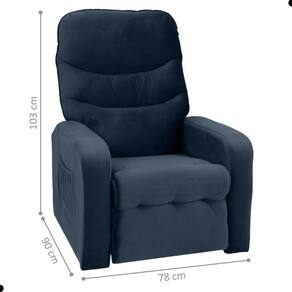 Requer montagem: Sim | Inclui manual de montagem: Sim | Quantidade de caixas de embalagem: 1 | Comprimento: 90 | Profundidade: 90 | Altura: 103 | Largura: 78 | CÔMODO INDICADO: Sala | COM APOIO DE BRAÇOS: Sim | QUANTIDADES DE CAIXAS DE EMBALAGEM: 1 | ALTURA DO PRODUTO COM EMBALAGEM (CM): 70 | MATERIAL PRINCIPAL: Veludo | ALTURA DO PRODUTO (CM): 103 | INSTRUÇÕES/CUIDADOS: Limpar com pano macio e seco, não utilizar produtos abrasivos | COM RODAS: Não | PESO MÁXIMO SUPORTADO: 110 | COR PREDOMINANTE: Azul | CORES DO PRODUTO (FILTRO DE CORES): Azul | COMPRIMENTO DO PRODUTO (CM): 90 | NOME DO PRODUTO NO FORNECEDOR: Poltrona Eletrica | TIPO DE CADEIRA: Poltrona | PESO PRODUTO COM EMBALAGEM (KG): 37 | DESCRIÇÃO DO TAMANHO: 103x78x90 cm | CONTEÚDO DA EMBALAGEM: 1 Poltrona | PRODUTO PRECISA DE MONTAGEM?: Sugerimos a contratação de um montador para a montagem do produto. Não nos responsabilizamos por causadas no ato da montagem. | É GIRATÓRIA: Não | MATERIAL PARA FILTRO: Veludo | PESO DO PRODUTO (KG): 37 | ESTADO DE ORIGEM: PR | PRODUTO: Poltrona | COM ENCOSTO RECLINÁVEL: Sim | COM ALTURA AJUSTÁVEL: Sim | LARGURA DO PRODUTO (CM): 78 | COMPRIMENTO PRODUTO COM EMBALAGEM (CM): 80 | LARGURA PRODUTO COM EMBALAGEM (CM): 80