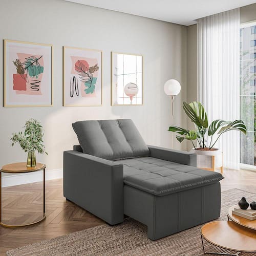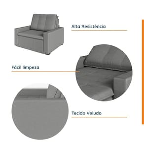 A Poltrona Palmeira CabeCasa MadeiraMadeira é a solução perfeita para quem tem pouco espaço disponível. Com ele você poderá se acomodar com conforto e praticidade. Produzido em madeira maciça de eucalipto, suporta até 200kg. Depois nos conte como foi a experiência de compra e como ficou seu ambiente nos comentários! Acompanha Almofadas extras: Não Acompanha Puff: Não Almofada do assento: Fixa Almofada do encosto: Removível Altura do assento até o chão: 48 cm Altura do Encosto: 60 cm Altura dos Pés: 3 cm Ambiente Principal: Sala de Estar Complexidade da Montagem: Baixa: pode ser montado por uma pessoa sozinha Cor: Cinza Cor do Produto: Cinza Design Assinado: Não Enchimento do Assento: Espuma D-25 Enchimento do Braço: Espuma D-18 Enchimento do Encosto: Fibra Siliconada Encosto para a Cabeça: Não Estampado: Não Extensível: Sim Firmeza do Assento: Não Possui Itens Inclusos: 1 Poltrona, 4 pés e manual de montagem Linha ou Coleção: Palmeira Manual de Montagem e Instalação: https://product-hub-prd.madeiramadeira.com.br/895111/documents/135ef752-1860-4c7f-a57b-e43b2702faedlpoltronapalmeirasempillow.pdf Material do Braço: Madeira de Eucalipto Material dos Pés: Plástico Modelo de Poltrona: Retrátil Necessita Montagem: Sim Peso: 38,64 kg Possui Percintas Elásticas: Sim Possui Pés: 04 Possui Rodízio: Sim Profundidade quando extendido: 144 cm Recomendações de Uso, Manutenção e Limpeza: Evitar exposição direta à luz solar, limpar com escova macia e aspirar o pó semanalmente, não utilizar produtos químicos, removedores, alvejantes, etc. Evite exercer pressão excessiva sobre determinada partes do estofado, não utilizar para limpeza equipamentos a vapor de água. Rodízio com Trava: Não Sistema de Montagem: Pés encaixados. Suporta Até (kg): 200 kg Tecido Predominante: Veludo Tipo de Assento: Fixo Tipo de Encosto: Fixo Tipo de Espuma do Assento: Espuma Convencional Tipo de Poltrona: Leitura