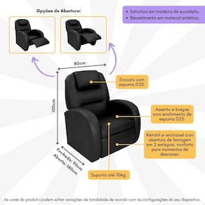 A Poltrona Retrátil e Reclinável 80cm com Material Sintético Multimóveis CR45266 possui mecanismo retrátil e reclinável que proporciona momentos tranquilos de descanso, com sistema de abertura de ferragem em 2 estágios. Com estrutura de madeira de eucalipto, essa poltrona se destaca pela durabilidade e resistência. O revestimento em material sintético confere um visual sofisticado, tornando-a ideal para diversos ambientes. O assento e as braças contam com enchimento de espuma densidade D23, garantindo conforto extra durante longos períodos de uso. Já o encosto, com espuma densidade D20, oferece o suporte necessário para relaxar plenamente. Com capacidade para suportar até 110kg, esta poltrona combina funcionalidade e elegância, sendo uma adição indispensável para o seu espaço de convivência.