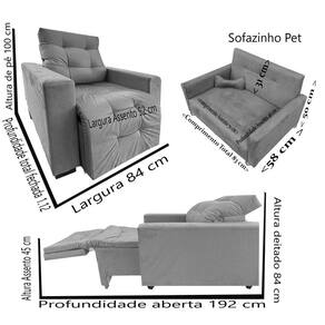 Medidas Poltrona Profundidade total fechada 1.12 Profundidade aberta 192 cm Largura 84 cm Altura de pê 100 cm Altura deitado 84 cm Medidas Do Sofa Pet Comprimento Total - 83 cm Comprimento Assento - 70 Cm Altura Total- 50 cm Altura Encosto- 31 cm Altura Assento - 21 cm Profundidade Total - 58 cm Profundidade Assento - 46 cm Para Gatos ou Caes De Porte Pequeno.