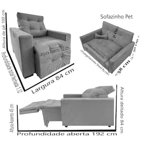 Medidas Poltrona Profundidade total fechada 1.12 Profundidade aberta 192 cm Largura 84 cm Altura de pê 100 cm Altura deitado 84 cm Medidas Do Sofa Pet Comprimento Total - 83 cm Comprimento Assento - 70 Cm Altura Total- 50 cm Altura Encosto- 31 cm Altura Assento - 21 cm Profundidade Total - 58 cm Profundidade Assento - 46 cm Para Gatos ou Caes De Porte Pequeno.