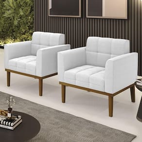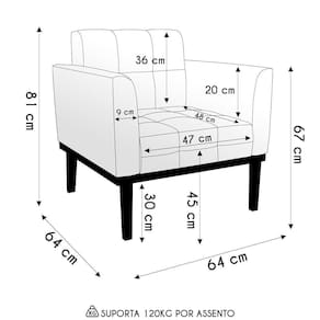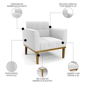 A Poltrona Para Sala é revestida em bouclé, que é confortável, suave ao toque, e ainda valoriza o design da poltrona. Os braços e encosto são confortáveis em espuma D-18, já o assento é com espuma D-26 de alta densidade, que garante um assento firme e aconchegante, ideal para relaxar após um dia cansativo. A base em madeira de eucalipto é um charme à parte, que confere um toque Rústico e sofisticado à peça. São 2 poltronas com estrutura resistente que suporta até 120 kg cada. A montagem é muito simples, pois a poltrona já vem pronta, bastando apenas fixar a base com os parafusos que acompanham o produto. A limpeza também é muito prática, pois basta utilizar um pano limpo e levemente úmido, sem produtos abrasivos, para manter a sua poltrona sempre em bom estado. Sem dúvidas a Poltrona Para Sala vai transformar seu ambiente, deixando mais confortável e estiloso!