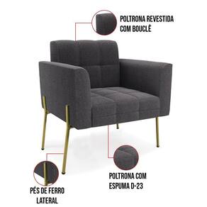 A Poltrona Elisa é uma poltrona que combina elegância, conforto e durabilidade. Ela tem um design retrô e sofisticado, com Pés Laterais de Ferro Dourado e revestimento em tecido Bouclê Grafite, que harmonizam com qualquer ambiente. Ela é ideal para sala de estar, recepções, escritórios, cozinhas ou qualquer outro espaço que você queira decorar com estilo e bom gosto. Ela tem uma estrutura em madeira de reflorestamento eucalipto, que garante a resistência e a sustentabilidade do produto. Ela suporta até 120 kg de peso, podendo ser utilizada por pessoas de diferentes biotipos. Ela tem um acabamento reforçado e espuma de qualidade D23, que oferece maciez e aconchego. Ela contém detalhes de costura no encosto e assento, resultando em um acabamento impecável, conferindo muito mais valor e elegância ao produto. A Poltrona Elisa é um móvel de alta qualidade, beleza e funcionalidade. Ela é fácil de transportar, pois tem um peso leve e um tamanho compacto. A Poltrona Elisa é um produto que vai fazer a diferença na sua decoração e no seu bem-estar. Ela vai trazer charme, conforto e durabilidade para o seu ambiente. Aproveite essa oferta e leve para casa uma poltrona de qualidade por um preço incrível. Essa é a sua chance de ter uma poltrona maravilhosa por um preço imperdível. Corra e garanta a sua antes que acabe o estoque!