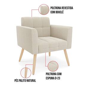 A Poltrona Elisa é uma poltrona que combina elegância, conforto e durabilidade. Ela tem um design retrô e sofisticado, com Pés Palito Natural e revestimento em tecido Bouclê. Ela é ideal para sala de estar, recepções, escritórios, cozinhas ou qualquer outro espaço que você queira decorar com estilo e bom gosto. Ela tem uma estrutura em madeira de reflorestamento eucalipto, que garante a resistência e a sustentabilidade do produto. Ela suporta até 120 kg de peso, podendo ser utilizada por pessoas de diferentes biotipos. Ela tem um acabamento reforçado e espuma de qualidade D23, que oferece maciez e aconchego. Ela contém detalhes de costura no encosto e assento, resultando em um acabamento impecável, conferindo muito mais valor e elegância ao produto. A Poltrona Elisa é um móvel de alta qualidade, beleza e funcionalidade. Ela é fácil de transportar, pois tem um peso leve e um tamanho compacto. A Poltrona Elisa é um produto que vai fazer a diferença na sua decoração e no seu bem-estar. Ela vai trazer charme, conforto e durabilidade para o seu ambiente. Aproveite essa oferta e leve para casa uma poltrona de qualidade por um preço incrível. Essa é a sua chance de ter uma poltrona maravilhosa por um preço imperdível. Corra e garanta a sua antes que acabe o estoque!