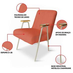 Estrutura: Metal e madeira de reflorestamento tratada (eucalipto), devidamente aparelhada, com reforços de cantoneiras e chapas em MDF. Material do Estofamento: Espuma D-28 (alta densidade) Revestimento: Linho Peso Máximo Suportado: Até 120 Kg Tipo de Pés: Base Metálica Industrial Material/Acabamento dos Pés: Aço Carbono com Pintura eletrostática Inclui Almofada Extra: Não Tipo de Encosto: Fixo Tipo de Assento: Fixo, percintas elásticas Possui Braços: Sim Material do Apoio de Braço: Madeira, com 7cm de largura Com Apoio de Pés: Não Com Altura Ajustável: Não É Reclinável: Não É Giratória: Não Diferenciais: Design moderno; Detalhes em traços verticais que valorizam o encosto e assento da poltrona. Complexidade da Montagem: Baixa Montagem: O produto é enviado montado. Garantia: 90 dias contra de fabricação Instruções de Limpeza: Utilizar um pano limpo e levemente úmido Quantidade de Volumes: 1 Caixa Medida das Embalagens: Caixa 1: 88 cm x 68 cm x 61 cm Peso Total das Embalagens: 11 kg : É feita somente até o térreo ou portaria. Confira sempre as medidas das embalagens para assegurar que o produto passe por portas e escadas do .