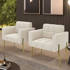 A Poltrona Elisa é uma poltrona que combina elegância, conforto e durabilidade. Ela tem um design retrô e sofisticado, com Pés Laterais de Ferro Dourado e revestimento em tecido Bouclê Bege, que harmonizam com qualquer ambiente. Ela é ideal para sala de estar, recepções, escritórios, cozinhas ou qualquer outro espaço que você queira decorar com estilo e bom gosto. Ela tem uma estrutura em madeira de reflorestamento eucalipto, que garante a resistência e a sustentabilidade do produto. Ela suporta até 120 kg de peso, podendo ser utilizada por pessoas de diferentes biotipos. Ela tem um acabamento reforçado e espuma de qualidade D23, que oferece maciez e aconchego. Ela contém detalhes de costura no encosto e assento, resultando em um acabamento impecável, conferindo muito mais valor e elegância ao produto. A Poltrona Elisa é um móvel de alta qualidade, beleza e funcionalidade. Ela é fácil de transportar, pois tem um peso leve e um tamanho compacto. A Poltrona Elisa é um produto que vai fazer a diferença na sua decoração e no seu bem-estar. Ela vai trazer charme, conforto e durabilidade para o seu ambiente. Aproveite essa oferta e leve para casa uma poltrona de qualidade por um preço incrível. Essa é a sua chance de ter uma poltrona maravilhosa por um preço imperdível. Corra e garanta seu Kit 2 Poltronas antes que acabe o estoque!