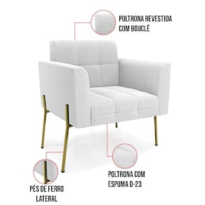 A Poltrona Elisa é uma poltrona que combina elegância, conforto e durabilidade. Ela tem um design retrô e sofisticado, com Pés Laterais de Ferro Dourado e revestimento em tecido Bouclê Off White, que harmonizam com qualquer ambiente. Ela é ideal para sala de estar, recepções, escritórios, cozinhas ou qualquer outro espaço que você queira decorar com estilo e bom gosto. Ela tem uma estrutura em madeira de reflorestamento eucalipto, que garante a resistência e a sustentabilidade do produto. Ela suporta até 120 kg de peso, podendo ser utilizada por pessoas de diferentes biotipos. Ela tem um acabamento reforçado e espuma de qualidade D23, que oferece maciez e aconchego. Ela contém detalhes de costura no encosto e assento, resultando em um acabamento impecável, conferindo muito mais valor e elegância ao produto. A Poltrona Elisa é um móvel de alta qualidade, beleza e funcionalidade. Ela é fácil de transportar, pois tem um peso leve e um tamanho compacto. A Poltrona Elisa é um produto que vai fazer a diferença na sua decoração e no seu bem-estar. Ela vai trazer charme, conforto e durabilidade para o seu ambiente. Aproveite essa oferta e leve para casa uma poltrona de qualidade por um preço incrível. Essa é a sua chance de ter uma poltrona maravilhosa por um preço imperdível. Corra e garanta seu Kit 2 Poltronas antes que acabe o estoque!