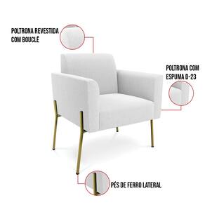 A Poltrona Marisa é a escolha perfeita para quem deseja unir conforto e comodidade em um estilo elegante. Com um design único, ela possui Pés de Ferro Lateral Dourado que harmoniza com o seu belíssimo tom Off White, criando uma combinação elegante de conforto e estilo. Ela é perfeita para quem busca móveis que não só sejam bonitos, mas que também proporcionem bem-estar. Ideal para compor salas de estar, recepções, bibliotecas, salas de leitura, espaços de design e até áreas comerciais, essa peça versátil é pensada para ambientes que excluam beleza e aconchego. Sua estrutura, em madeira de reflorestamento de eucalipto, oferece resistência e sustentabilidade, suportando até 120 kg, garantindo segurança para usuários de diferentes biotipos. O conforto é outro destaque, com estofado em espuma prorelax D-23, que proporciona suporte e maciez ideais. Revestida em Bouclê, um tecido maleável e sofisticado, a Poltrona Marisa segue a tendência do momento com um toque suave e quente, remetendo à textura natural da lã. Leve e fácil de transportar, a Poltrona Marisa é um item que agrega charme e durabilidade ao seu espaço. Não perca a oportunidade de adquirir essa peça exclusiva que fará toda a diferença na sua decoração e no seu bem-estar. Aproveite agora!