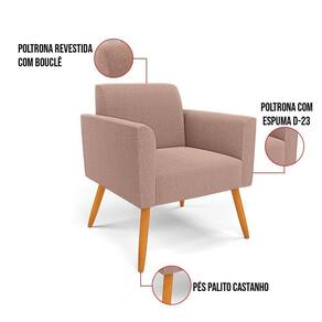 A Poltrona Marisa é a escolha perfeita para quem deseja unir conforto e comodidade em um estilo elegante. Com um design único, ela possui Pés Palito Castanho que harmoniza com o seu belíssimo tom, criando uma combinação elegante de conforto e estilo. Ela é perfeita para quem busca móveis que não só sejam bonitos, mas que também proporcionem bem-estar. Ideal para compor salas de estar, recepções, bibliotecas, salas de leitura, espaços de design e até áreas comerciais, essa peça versátil é pensada para ambientes que excluam beleza e aconchego. Sua estrutura, em madeira de reflorestamento de eucalipto, oferece resistência e sustentabilidade, suportando até 120 kg, garantindo segurança para usuários de diferentes biotipos. O conforto é outro destaque, com estofado em espuma prorelax D-23, que proporciona suporte e maciez ideais. Revestida em Bouclê, um tecido maleável e sofisticado, a Poltrona Marisa segue a tendência do momento com um toque suave e quente, remetendo à textura natural da lã. Leve e fácil de transportar, a Poltrona Marisa é um item que agrega charme e durabilidade ao seu espaço. Não perca a oportunidade de adquirir essa peça exclusiva que fará toda a diferença na sua decoração e no seu bem-estar. Aproveite agora! OBSERVAÇÃO IMPORTANTE: A é realizada no informado, não realizamos o para andares superiores, como subir escadas, elevadores ou guinchos. Não realizamos montagens, desmontagens ou instalações. Todos esses serviços são de responsabilidade do comprador. Dimensões do Produto: Altura Total: 81 cm Largura Total: 64 cm Profundidade Total: 64 cm Peso: 14 kg Outras medidas: Altura do Encosto: 36 cm Largura do Assento: 47 cm Profundidade do Assento: 48 cm Altura do chão ao Assento: 45 cm Espessura do Braço: 9 cm Altura interna do Braço: 20 cm Espessura do Assento: 18 cm Tamanho dos pés: 30 cm Especificações do Produto: Estrutura: Madeira de Reflorestamento de Eucalipto Espuma: D-23 Tecido: Bouclê Peso Suportado: Até 120 Kg Tipo de Pés: Pés Palito de Madeira Tipo de Encosto: Fixo Tipo de Assento: Fixo Complexidade da Montagem: Baixo Montagem: O produto vai montado, apenas rosquear os pés : 90 dias contra de fabricação Instruções de Limpeza: Utilizar um pano limpo e levemente úmido Você irá Receber: 01 Poltrona - Entregue em: 01 Volume