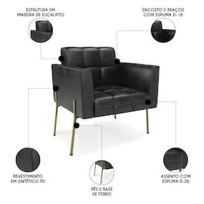 Você está procurando uma poltrona que combine com a sua Sala De Estar, recepção ou seu quarto, que ofereça conforto e qualidade? Então você vai adorar a Poltrona Para Sala Pés Metálicos Dourado Ana Sintético PU Preto, da Ibiza!