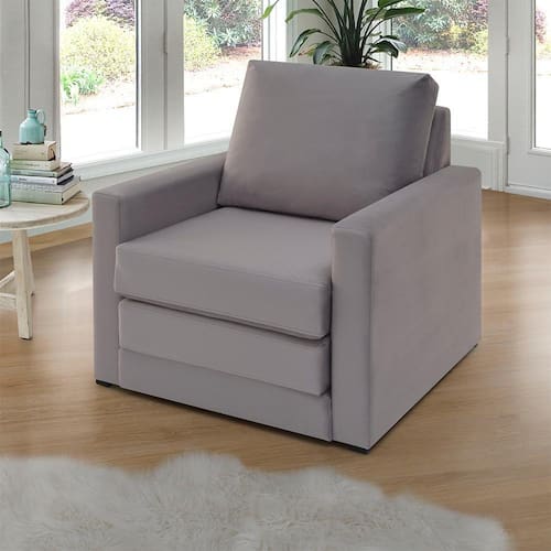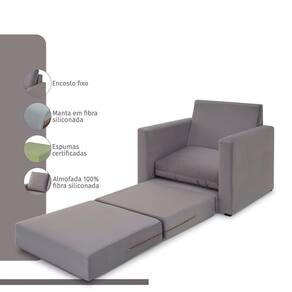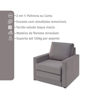 Assentos com espuma flexível de poliuretano densidade 26kg/m, certificada, fabricação própria. Com assento dobráveis, ela abre totalmente virando uma cama. Enchimento do encosto: espuma D-26 e fibra de poliéster siliconada. Estrutura de madeira maciça de pinus e eucalipto 100% reflorestada. Fixação da estrutura: grampos galvanizados anti-ferrugem. Apoiados no chão com sapatas de pvc. Revestimento/tecido: veludo 100% poliéster, com toque macio.